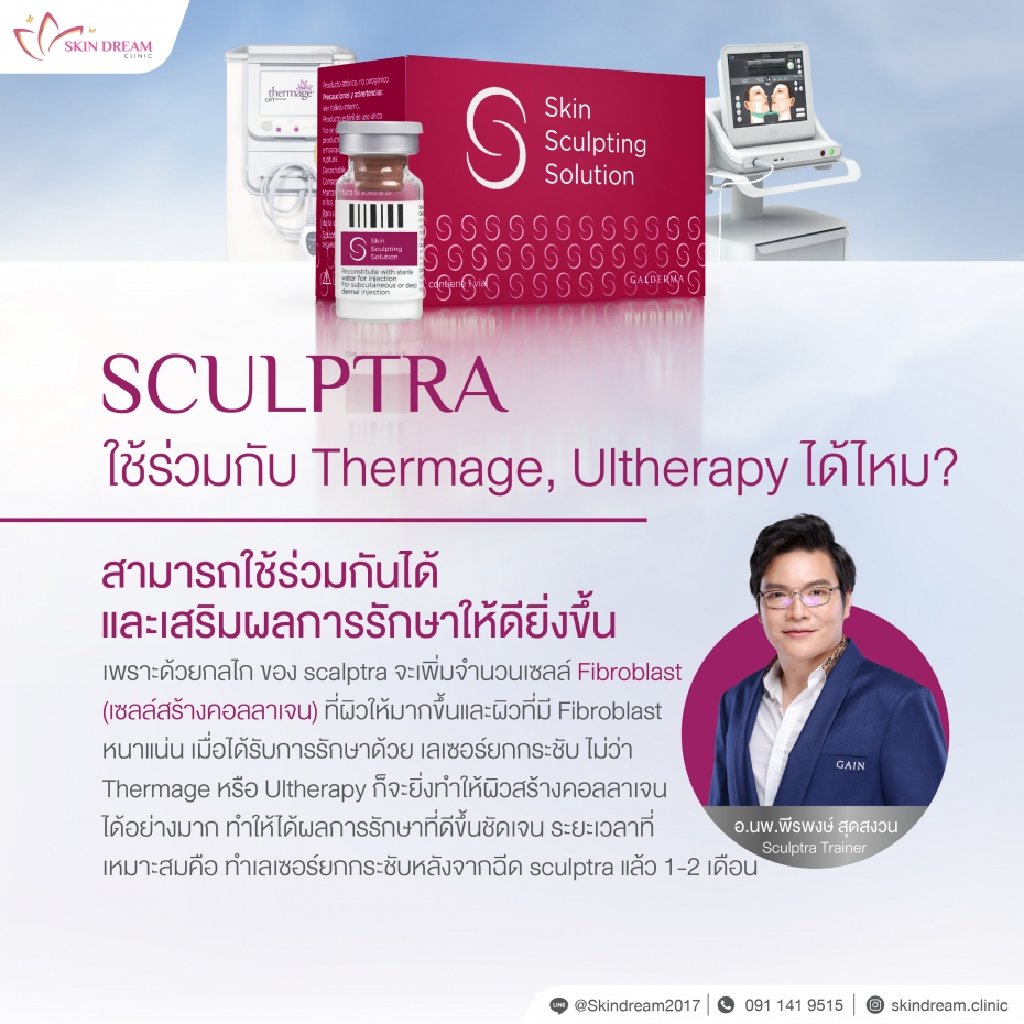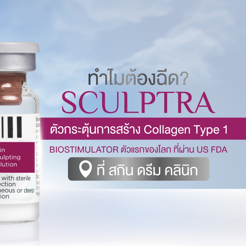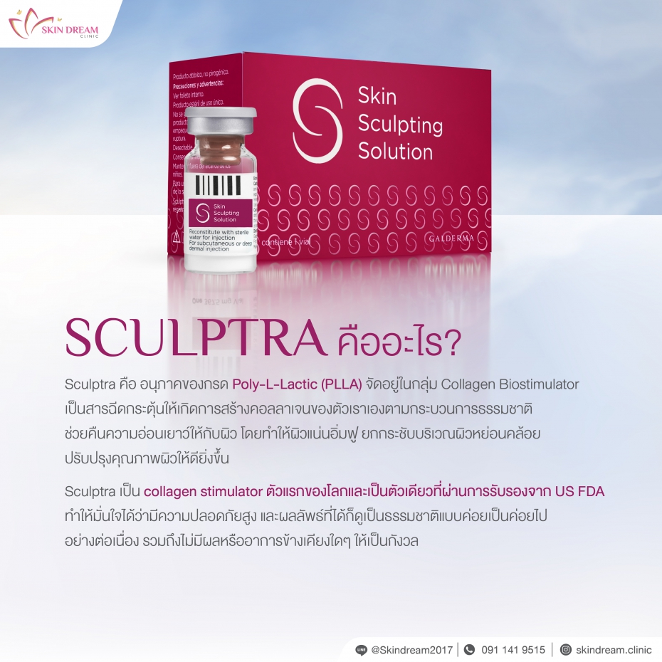 “SCULPTRA” คือ สารกำเนิดคอลลาเจนในรูปแบบฉีดที่ประกอบด้วยอนุภาคของ PLLA (Poly-L-Lactic Acid) มีคุณสมบัติช่วยกระตุ้นการสร้างคอลลาเจน เติมเต็ม และยกกระชับใบหน้า สามารถอยู่ได้นานถึง 2 ปี โดยมุ่งเน้นกระตุ้นการสร้างคอลลาเจนชนิดที่ 1 (Collagen Type I) ได้ดีมากเป็นพิเศษ ซึ่งเป็นหนึ่งในคอลลาเจนมากกว่า 16 ชนิดที่ร่างกายผลิตได้ พบมากกว่าร้อยละ 90 ของปริมาณคอลลาเจนทั้งหมดในร่างกาย ช่วยเสริมสร้างความยืดหยุ่น ช่วยสมานแผล สามารถพบได้ทั้งในผิวหนัง เส้นผม กระดูก เนื้อเยื่อ และผนังหลอดเลือด โดย SCULPTRA สามารถกระตุ้นให้เกิดการผลิตคอลลาเจนชนิดที่ 1 ได้มากถึงร้อยละ 66.5 หลังจากฉีดไปแล้ว 3 เดือน