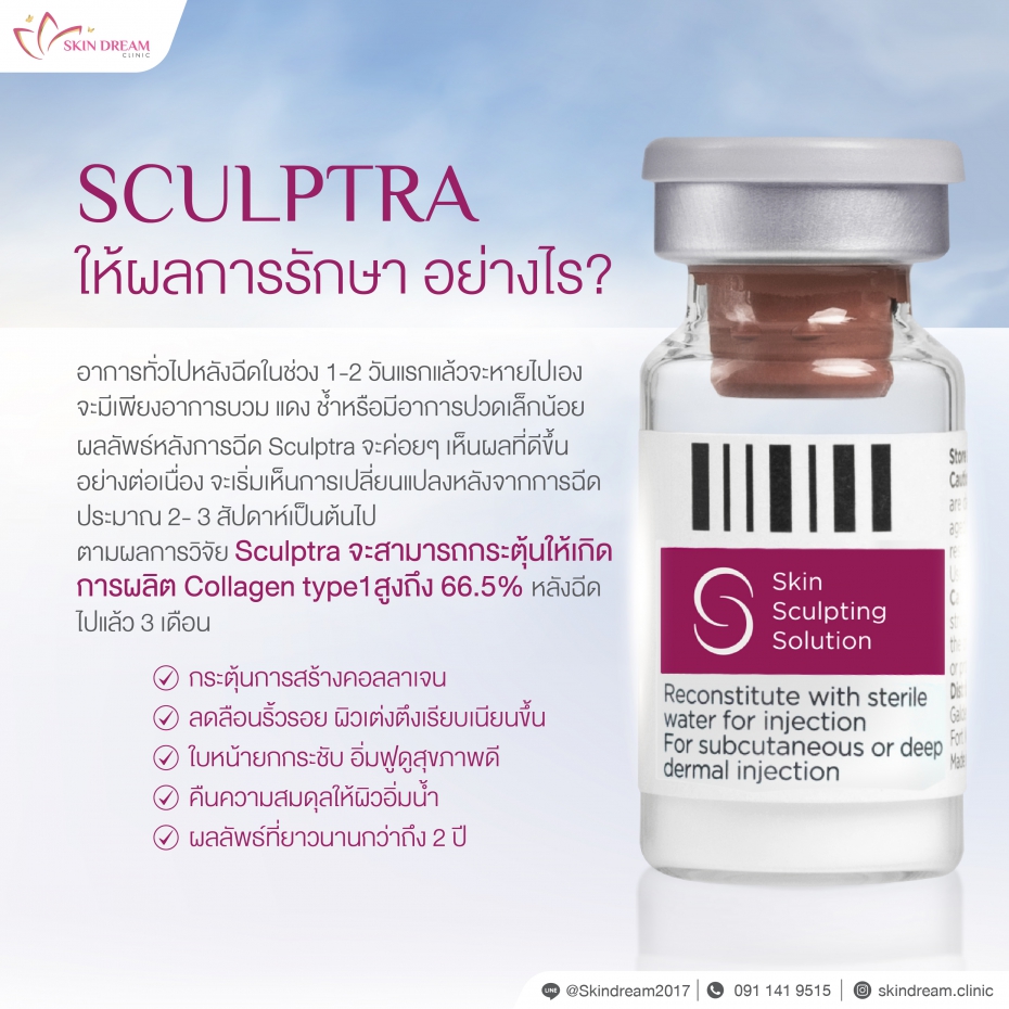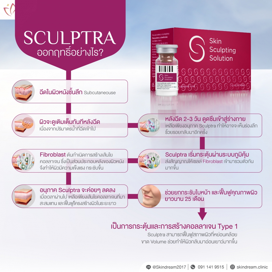 SCULPTRA จะถูกผสมด้วย Sterile water ก่อนนำไปฉีดเข้าผิวชั้น Subcutaneous บริเวณขมับ หน้าแก้ม ใต้โหนกแก้มด้านข้าง เป็นหลัก ตัวยาจะกระจายตัวไปทั่วชั้นผิว สาร PLLA จะไปเพิ่มปริมาณเซลล์ ไฟโบรบลาสต์ (Fibroblast) ซึ่งเป็นเซลล์ที่เป็นตัวสร้างโปรตีนสองชนิด คือ คอลลาเจนและอิลาสติน ช่วยสร้างความแข็งแรงให้โครงสร้างผิวภายใน คอยพยุงผิวหนังชั้นเดอมิส (dermis) หรือผิวหนังชั้นกลางที่ประกอบด้วยเนื้อเยื่อเกี่ยวพันยืดหยุ่น ในบริเวณตรงนี้จะพบเซลล์ไฟโบรบลาสท์จำนวนมาก นอกจากนี้ สาร PLLA จะเปลี่ยนแปลงเป็นกรดแล็กทิก (Lactic acid) เป็นกรดอยู่ในตระกูลเดียวกันกับ AHA ช่วยผลัดเซลล์ผิวเก่าที่ตายแล้วให้เผยผิวใหม่ที่กระจ่างใสและเนียนนุ่ม ไปกระตุ้นขบวนการสังเคราะห์เส้นใยคอลลาเจน ผ่านเม็ดเลือดขาวที่เรียกว่า “แมคโครฟาจ” (Macrophage) ซึ่งเป็นเม็ดเลือดขาวชนิดที่คอยขจัดสิ่งแปลกปลอมที่หลุดรอดเข้าไปในร่างกายมาช่วยในการทำงาน ส่งผลให้ PLLA ค่อย ๆ สลายไป แต่การสะสมของคอลลาเจนยังคงอยู่ จึงสามารถช่วยลบเลือนริ้วรอยให้ดูจางลง รอยเหี่ยวย่นหรือหลุมลึกดูตื้นขึ้น สามารถรู้สึกได้ตั้งแต่สัปดาห์แรกหลังรับการรักษาและกระตุ้นการสร้างคอลลาเจนให้เกิดขึ้นอย่างต่อเนื่อง