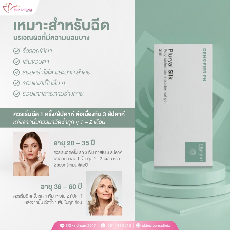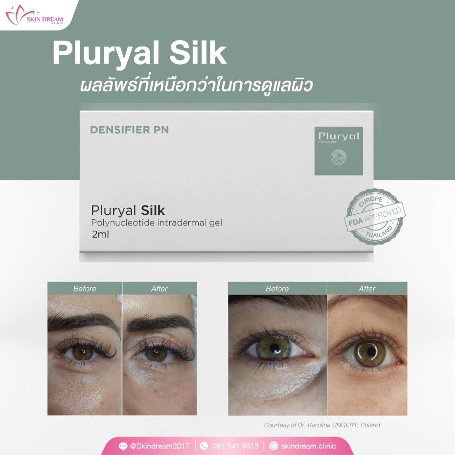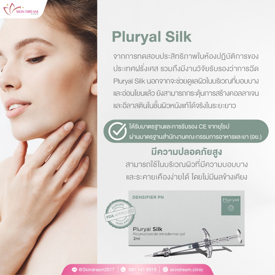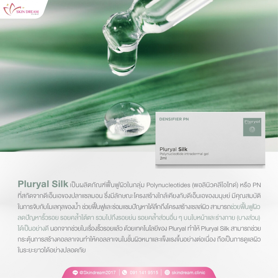 Pluryal Silk เป็นผลิตภัณฑ์เจลโพลินิวคลีโอไทด์สำหรับฉีดในชั้นผิวหนัง มีส่วนผสมจากธรรมชาติ สกัดจากปลาแซลมอนที่มีน้ำหนักโมเลกุล 80 ถึง 2,000 K Da มีคุณสมบัติในการจับกับโมเลกุลของน้ำ ร่างกายสามารถดูดซึมได้ เป็นผลิตภัณฑ์ที่สามารถช่วยฟื้นฟูและซ่อมแซมปัญหาผิวได้ตรงจุด ทั้งปัญหาริ้วรอย รอยคล้ำใต้ตา รวมไปถึงรอยย่น รอยคล้ำส่วนอื่น ๆ บนใบหน้าและร่างกาย (บางส่วน) นอกจากนี้ ยังช่วยกระตุ้นไฟโบรบลาสต์ ซึ่งเป็นเซลส์ที่มีส่วนช่วยในการสร้างคอลลาเจนในชั้นผิวหนัง ทำให้ผิวแข็งแรงและดูสุขภาพดีขึ้นอย่างต่อเนื่อง